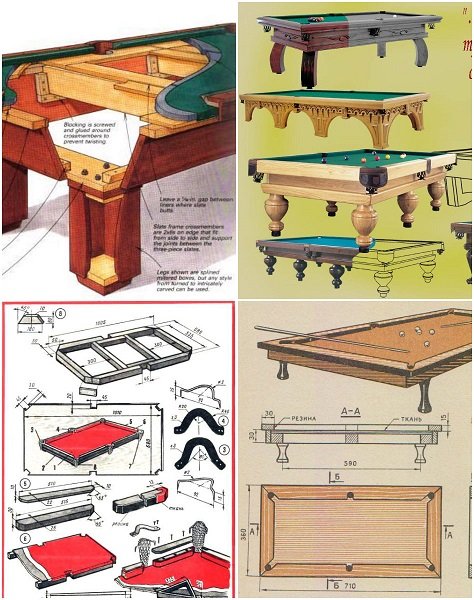 Для того чтобы сделать бильярдный стол своими руками, понадобится стандартный набор инструментов, который присутствует в мастерской или гараже практически любого мужчины. Специальным оборудованием в этом случае выступают электролобзик и дрель. Понадобится чертеж, некоторых останавливает именно это – изготовление чертежа кажется делом немыслимым. В этой книге чертежи и результат опыта конструирования и изготовления бильярдных столов различных типов и размеров. Дополнительно - Building a Pool Table - статья из Fine Woodworking Magazine.